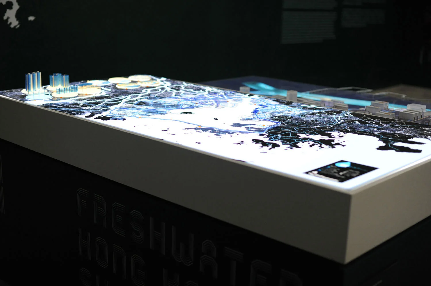 This exhibit is part of the Counterpart Cities project, showcased at the Shenzhen and Hong Kong Biennales. In response to the pressing challenges of climate change and freshwater scarcity in the region, the design team proposed an innovative solution: the Pearl River Delta Special Ecological Area (PRD SEA). This zone envisions an integrated network of water resources designed to enhance sustainability. The concept is presented through large-scale models, architectural renderings, and an immersive video display.